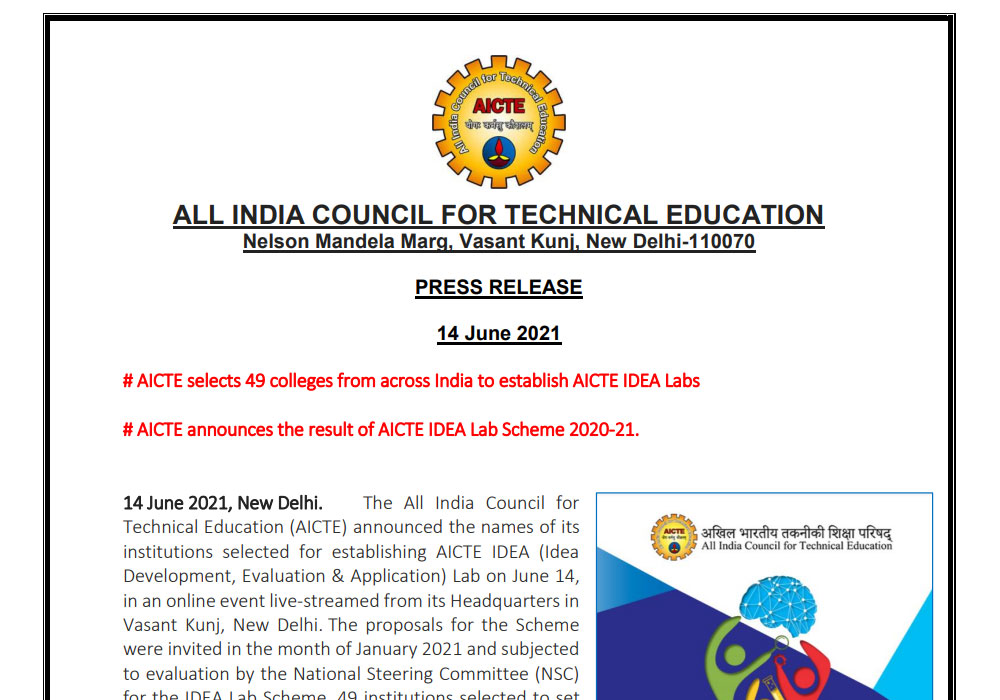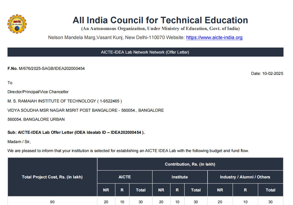 AICTE announced the results of the IDEA Lab Scheme, strengthening the national innovation ecosystem and encouraging continued efforts by institutions such as MSRIT to establish dedicated ideation and prototyping facilities.