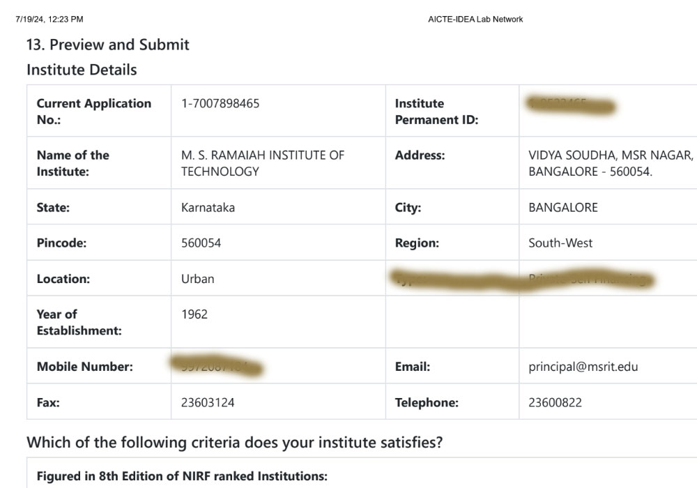 MSRIT formally submitted its proposal to the AICTE IDEA Lab Scheme with Dr. N.V.R. Naidu as Chief Mentor, Dr. Chethan Kumar C.S. as Coordinator, and Dr. Rama Sivakiran Reddy as Co-Coordinator.